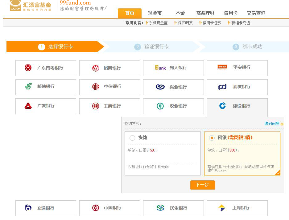 第一步 登陸匯添富官網(wǎng)網(wǎng)頁(yè)賬戶,點(diǎn)擊“首頁(yè)”-“銀行卡管理”,選擇“添加銀行卡”