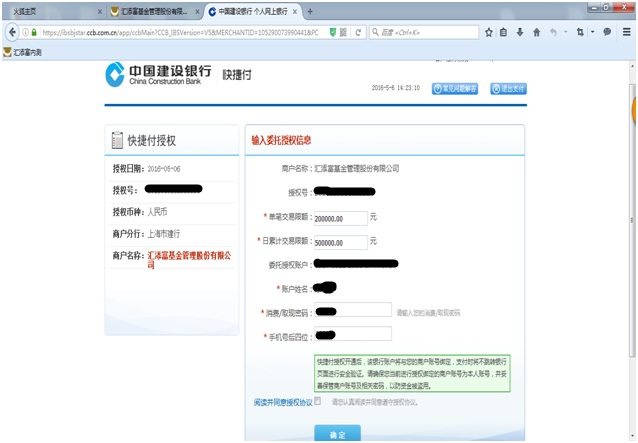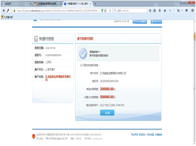 3.7 建行網(wǎng)銀快捷付授權(quán)成功,點(diǎn)擊"關(guān)閉"后,返回匯添富網(wǎng)上交易系統(tǒng)注冊(cè)頁(yè)面;