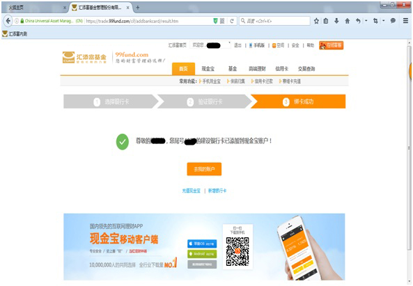 3.8 回到匯添富網(wǎng)站頁(yè)面。提示綁卡成功。