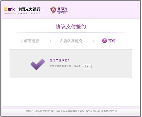 3.4 進入?yún)f(xié)議支付簽約成功頁面,點擊頁面上的“返回”