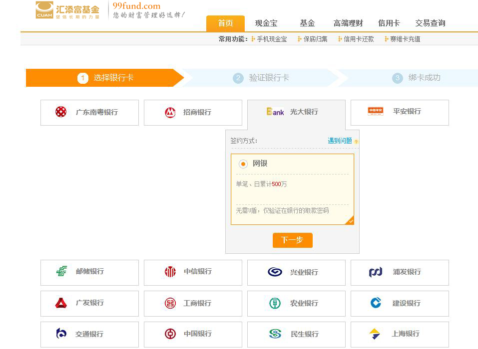 第一步 登陸匯添富官網(wǎng),點擊“首頁”-“銀行卡管理”,選擇“添加銀行卡”