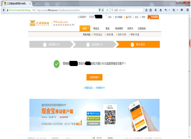 3.5 回到匯添富網(wǎng)站頁面,提示綁卡成功。