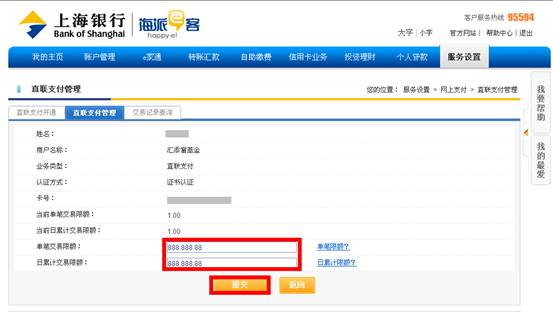 5. 輸入單筆和日累計(jì)限額后點(diǎn)擊“提交”按鈕