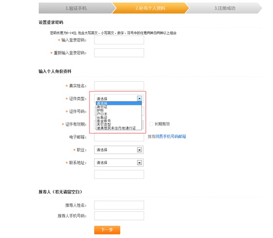 第三步:補充個人資料,選擇的證件類型請與您銀行卡開戶證件類型保持一致。